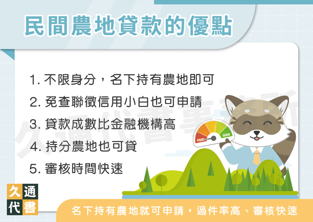 - 貸款成數比金融機構高,可達農地鑑價9成。