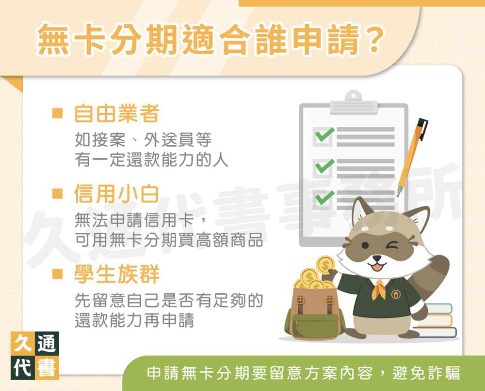 以上就是無卡分期的介紹,久通代書再次提醒你,申請無卡分期前一定要特別留意方案內容,千萬別落入不法商家的詐騙陷阱中,否則不僅沒有買到商品,後續還要償還高額款項,可是非常不划算的喔!